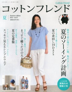 コットンフレンド(Cotton friend)2013年夏号 掲載 コットンフレンド(Cotton friend)2013年夏号 [雑誌] (06月号vol.47) 出版社: ブティック社; 季刊版 (2013/5/7) 発売日: 2013/5/7 内容紹介:簡単で着心地のいい服、集めました! 夏のソーイング計画 夏の着回し14Days、まっすぐ縫うだけの大人服、夏の定番服、 スッキリ見えるシンプルウエア、半日でできるハンドメイドアイディア集、 折り紙で作るくまモンなど — work-Media 2013-05-07 NEWS amam